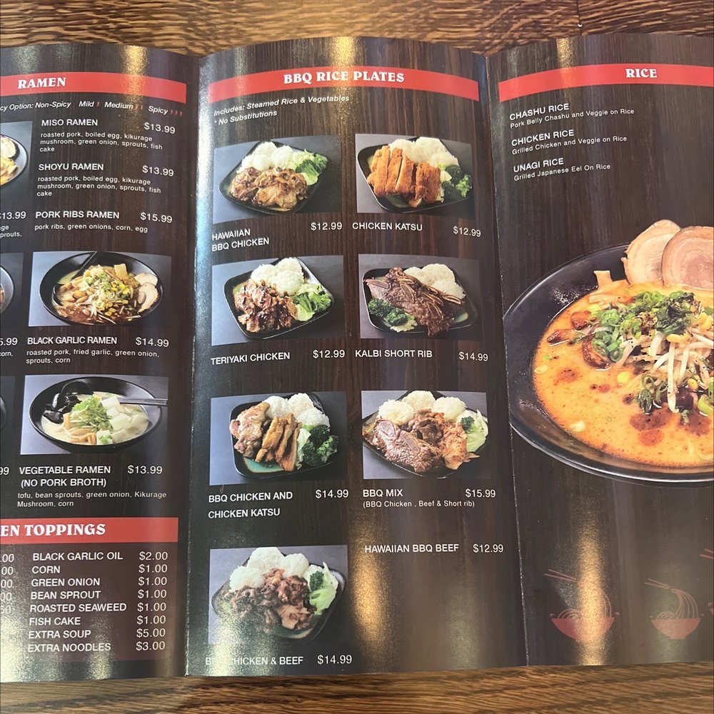 Introducing Ramen 101, a barbeque ramen spot located in Rancho Cordova, CA. The menu offers a variety of starters like Agedashi Tofu and Crab Rangoons, along with rice options such as Beef Rice and Chashu Rice. The star of the show, the ramen selections, include Black Garlic Ramen, Chicken Ramen, and Miso Ramen, all packed with flavorful ingredients like roasted pork, bamboo shoots, and boiled eggs. Customers have raved about the delicious Tong Katsu Ramen and the generous portions of rice plates. The staff is friendly, the atmosphere is relaxed, and the self-serve style adds to the casual dining experience. If you're in the area and craving a satisfying ramen fix, Ramen 101 is a must-visit destination.